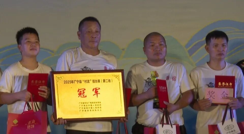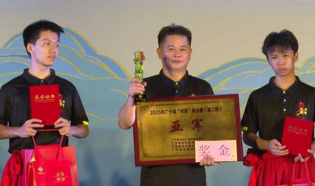 随着最后一轮对决落下帷幕,这场激烈的武术比赛终于迎来收官时刻。经过20轮硬核比拼,排沙镇木塝村凭借更稳定的发挥和精湛技艺摘得桂冠,古水镇牛岐村荣获亚军。古水镇、排沙镇和赞助企业广宁县古水供销合作社食品厂分别为获奖队伍颁发荣誉牌匾与礼品。
